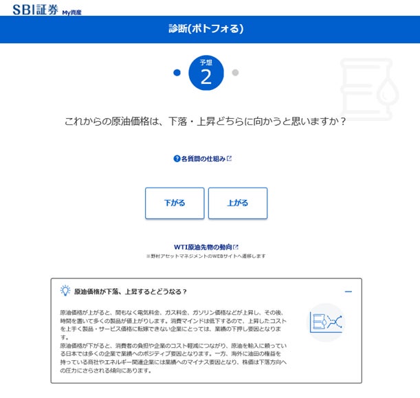 経済環境に対するいくつかの質問に回答すると、ご自身で選んだシナリオに合わせて、保有銘柄のスコア、関連するETFやレポートを表示し、分析結果に合わせて「購入」や「売却」など次のアクションをレコメンドします。
