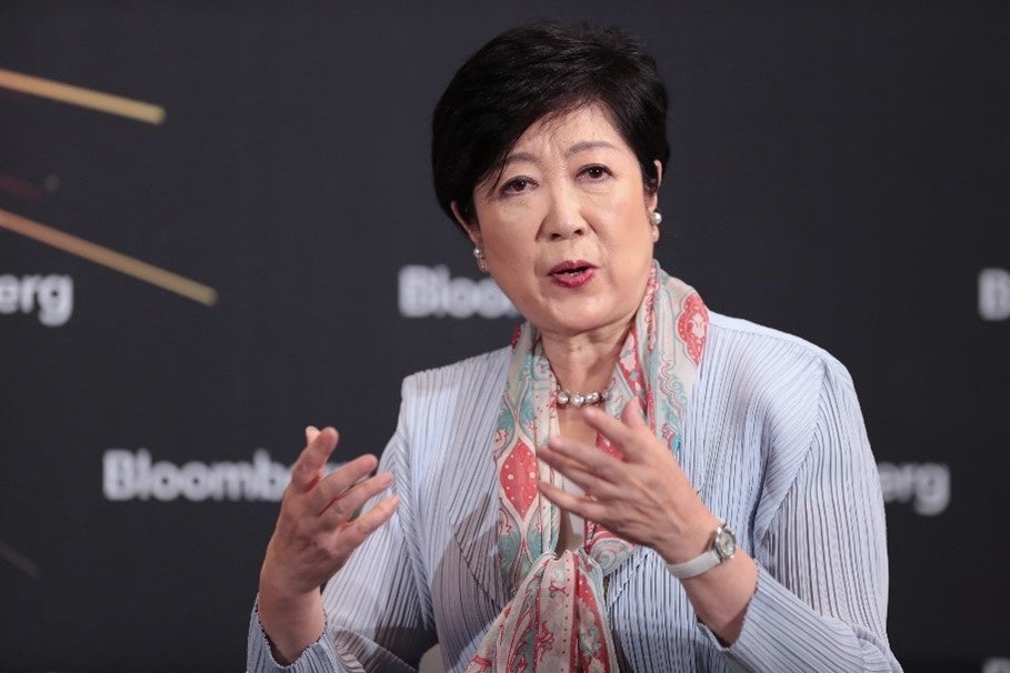 小池百合子東京都知事(右から2番目)、ブルームバーグ東京支局長 西沢加奈(右)、ブルームバーグ・クイックテイク 森来実記者(左)
