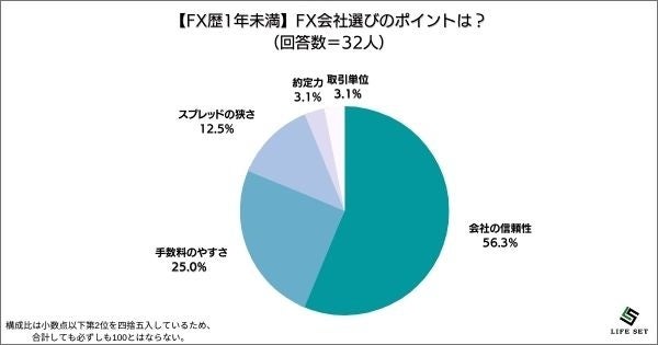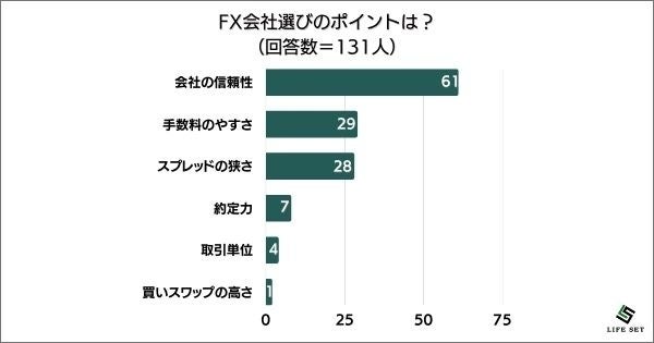 ・会社の信頼性(17人):取引単位、スプレッドの狭さで選んでいたのですが、最近は、出金できないというような話を聞いたので、まずは信頼性重視になりました。