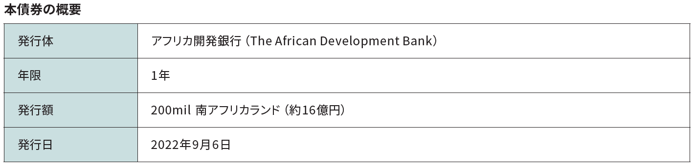 ソニー銀行株式会社(代表取締役社長:南 啓二/本社:東京都千代田区/以下 ソニー銀行)は、アフリカ開発銀行(正式名称:The African Development Bank、以下 AfDB)が南アフリカランド建としてはじめて発行するグリーンボンド(以下 本債券)への投資を実施しましたのでお知らせいたします。