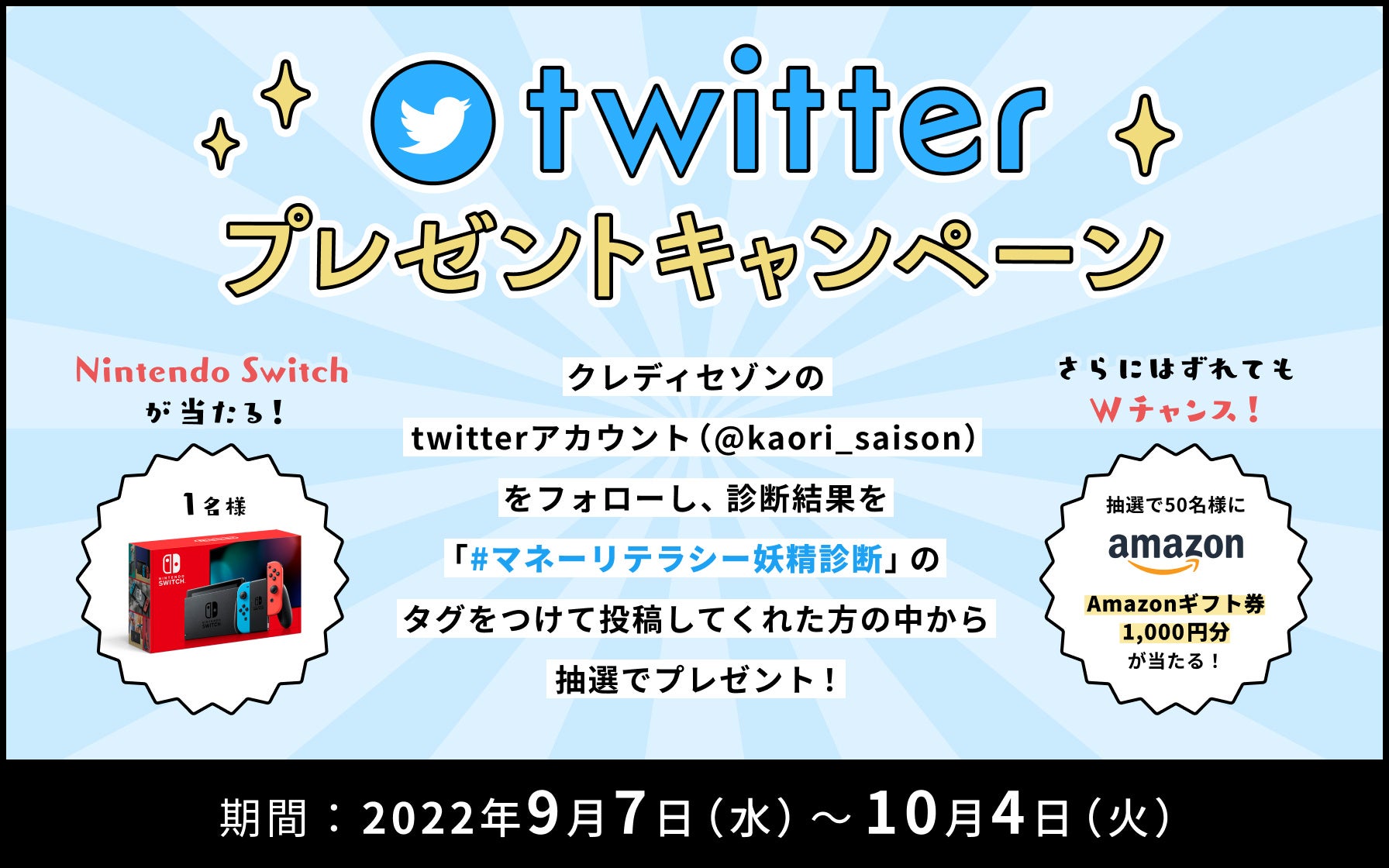 クレディセゾン公式Twitterアカウント(@kaori_saison)をフォローし、マネーリテラシー妖精診断結果を「#マネーリテラシー妖精診断」のタグをつけてツイートしてくれた方の中から抽選で1名様にNintendo Switchが当たります。さらに、はずれた方にもチャンス!抽選で50名様にAmazonギフト券 1,000円分が当たります。