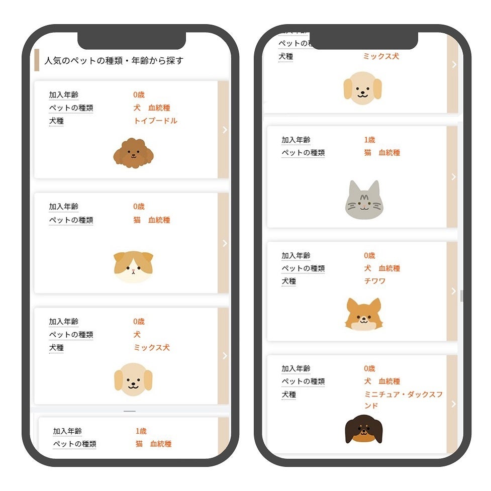 例えば「トイ・プードル・0歳」のように犬種・猫種と年齢を選ぶと、検索結果がすぐに表示されるようになっています。当比較サイトで検索されやすい6種類の犬猫種をピックアップしております。