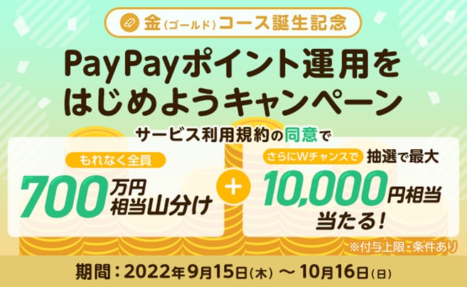 そして、このたび新コースの追加を記念して、2022年9月15日(木)から10月16日(日)までの期間中、新たにポイント運用の利用規約に同意をしたお客さまを対象に700万円相当の金(ゴールド)コースの運用中残高(運用ポイント)を山分けし、さらに抽選で最大10,000円相当の金(ゴールド)コースの運用中残高(運用ポイント)がプレゼントされる「金(ゴールド)コース誕生記念!PayPayポイント運用をはじめようキャンペーン」を実施します。