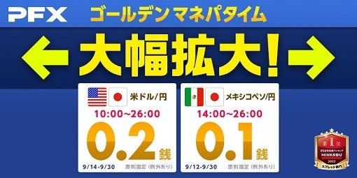 株式会社 マネーパートナーズ(代表取締役社長:福島秀治、本社:東京都港区、以下「当社」)は、17時~26時を『ゴールデン マネパタイム』とし、業界最狭水準スプレッドを提示するキャンペーンを実施していますが、9月14日より10時~17時までの「米ドル/円」も0.2銭と業界最狭水準スプレッドを提示いたします。原則固定(例外あり)