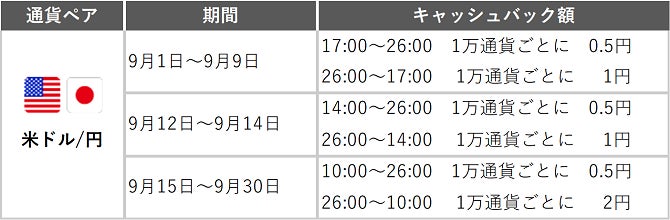 - 9/15~米ドル/円のキャッシュバック額が2円へ増額