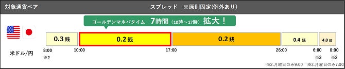 ※1.主要経済指標発表時等の急変時、国内外の休日や平日早朝など著しい流動性低下時はやむをえずスプレッドを拡大する場合がございます。 メンテナンス時間(火曜日~金曜日 各日5:55~6:10、土曜日5:50~月曜日7:00)は適用時間に含まれません。