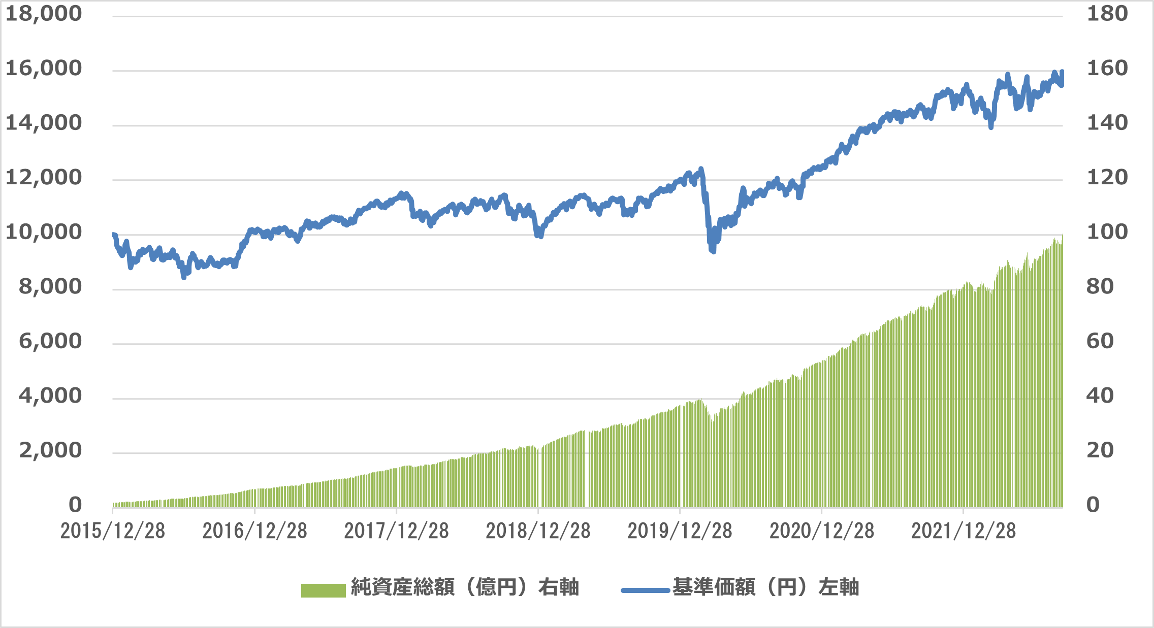 純資産総額と基準価額の推移 期間:2015年12月28日~2022年9月9日(日次データ)