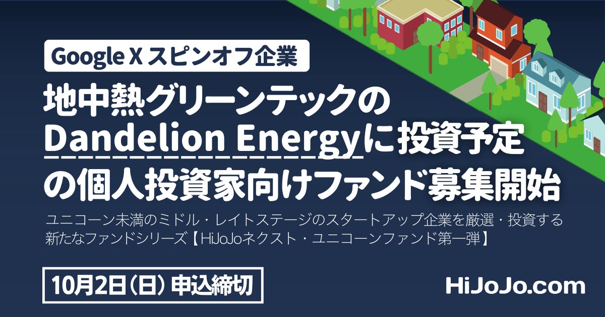 HiJoJo Partners株式会社は、Google社の研究開発プロジェクトを発祥とする、地中熱を活用した住宅用冷暖房システムの開発・導入に取り組む「Dandelion Energy」に投資予定のファンドを2022年9月16日(金)に募集を開始します。
