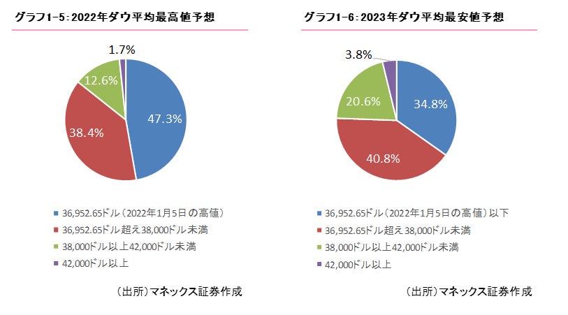 1-2. 2022年のダウ平均最高値は「36,952.65ドル(2022年1月5日の高値)」が最多、2023年のダウ平均最高値は「36,952.65ドル超え38,000ドル未満」が最多。2022年のダウ平均最安値は「29,653.29ドル(2022年6月17日の安値)」が最多、2023年のダウ平均最安値は「29,653.29ドル(2022年6月17日の安値)以上」が最多。