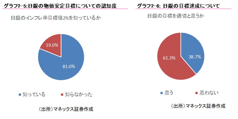 日銀が掲げる物価安定目標が2%であることを知っているかたずねたところ、「知っている」との回答が81%となりました。また、その目標について適切と思うかについては、「適切と思わない」が61%と半分以上となりました。本来日銀が目指しているのは物価の上昇と賃金の上昇ですが、現在は賃金上昇のペースが緩いことから物価上昇の弊害が意識されやすい結果なのかもしれません。
