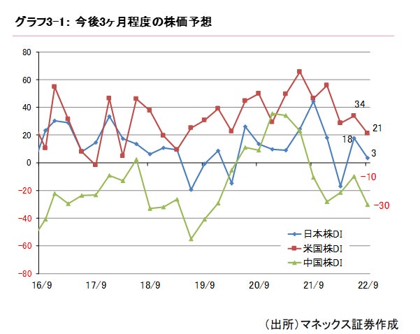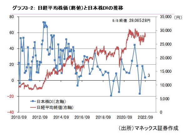 【日本株DI】(2022年6月)18→(2022年9月) 3(前回比-15ポイント)