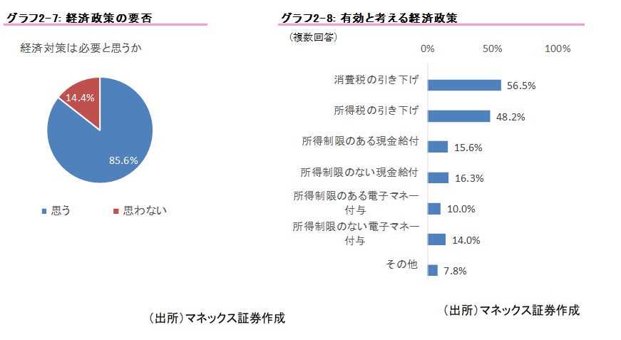 物価上昇に対応した経済対策の必要性や望ましい対策についてたずねました。経済対策が必要と思う投資家は86%と大多数でした。有効と考える経済政策は「消費税の引き下げ」の割合が56.5%で最も高く、「所得税の引き下げ」が48.2%で次に多くなりました。物価上昇に伴い経済対策を求める声が多く最も求められている政策は税率の引き下げのようです。