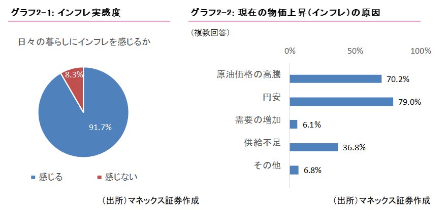日々の暮らしでのインフレ実感についてたずねました。インフレを感じると回答したのは全体の92%と圧倒的多数が生活のなかでインフレを実感していると回答しました。現在のインフレの原因については、円安との回答の割合が79%と最も高く、原油価格の高騰が70.2%と次に高くなりました。需要の増加との回答は6.1%とわずかで、現在のインフレは需要の増加が物価上昇につながる「ディマンドプルインフレ」でなく原材料価格等の上昇が物価上昇につながる「コストプッシュインフレ」だと考えている投資家の割合が高いことがわかりました。