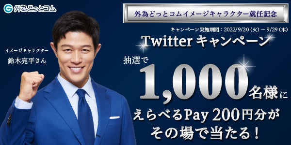 株式会社外為どっとコム(本社:東京都港区、代表取締役社長:竹内 淳) は、俳優の鈴木亮平さんが当社新イメージキャラクターに就任したことを記念いたしまして、期間内に公式Twitter「外為どっとコム」をフォロー&対象ツイートをリツイートし、アンケートに回答いただいた方を対象に、抽選で1,000名様へ「えらべるPay 200円分」が当たるキャンペーンを実施いたします。
