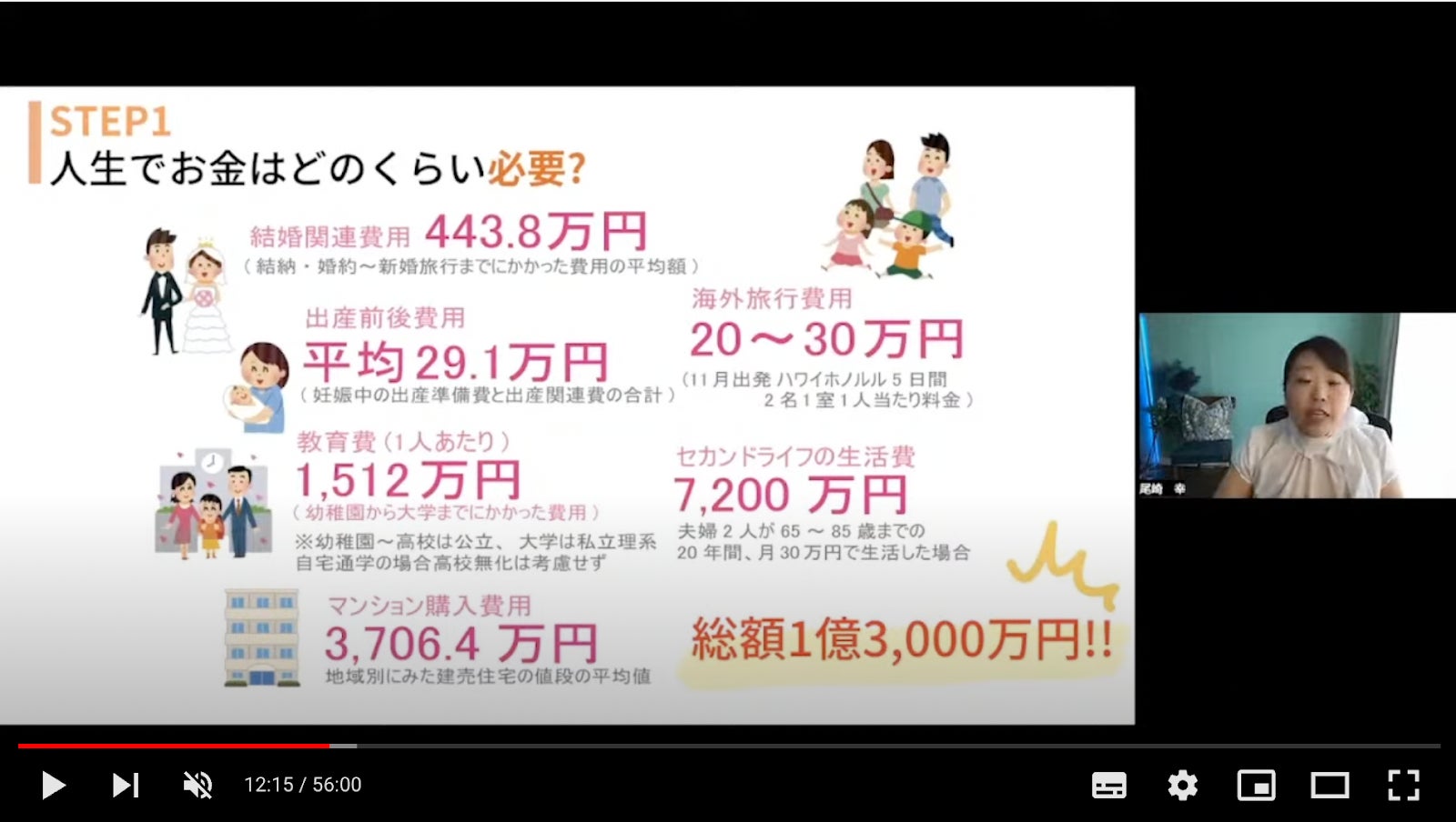 当日は、年間200世帯を担当する家計コンサルの尾崎幸様を迎えて「人生の選択肢を増やすお金の3つの考え方」に関するオンラインセミナーを実施いたしました。
