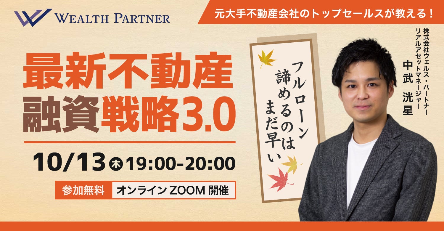 富裕層向けにIFA事業始め、資産運用のコンサルティングを行う株式会社ウェルス・パートナー(代表取締役:世古口俊介、本社:東京都港区、以下「当社」)は、オンラインセミナー「最新不動産融資戦略3.0〜フルローン諦めるのはまだ早い〜」を2022年10月13日(木)19:00〜20:00に開催いたします。