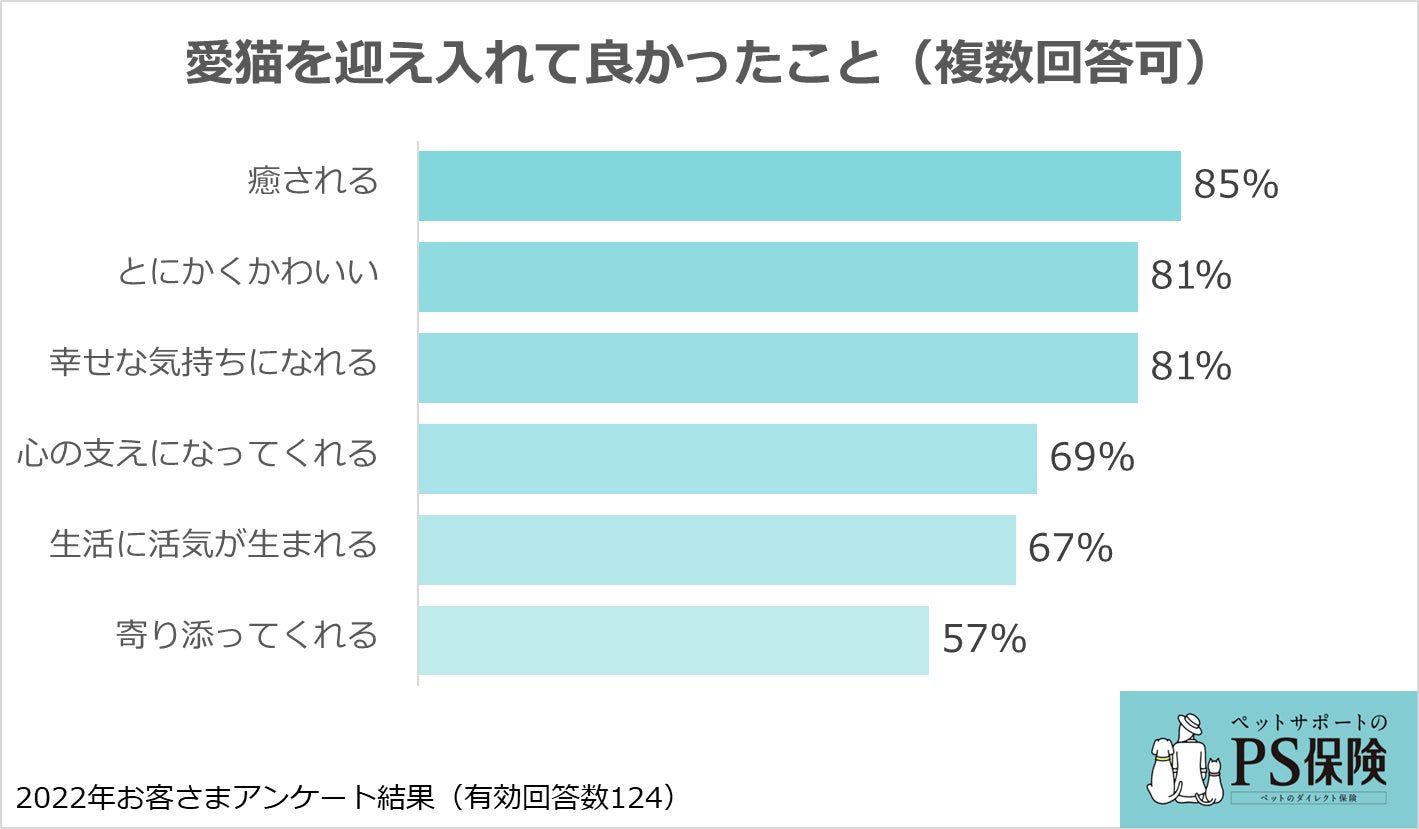 猫の飼い主に、愛猫を迎え入れて良かったことをたずねたところ、1位は「癒される」(85%)、2位「とにかくかわいい」「幸せな気持ちになれる」(共に81%)でした。これらは、猫の見た目やしぐさなど、飼い主が猫から受ける印象が大きいと思われます。
