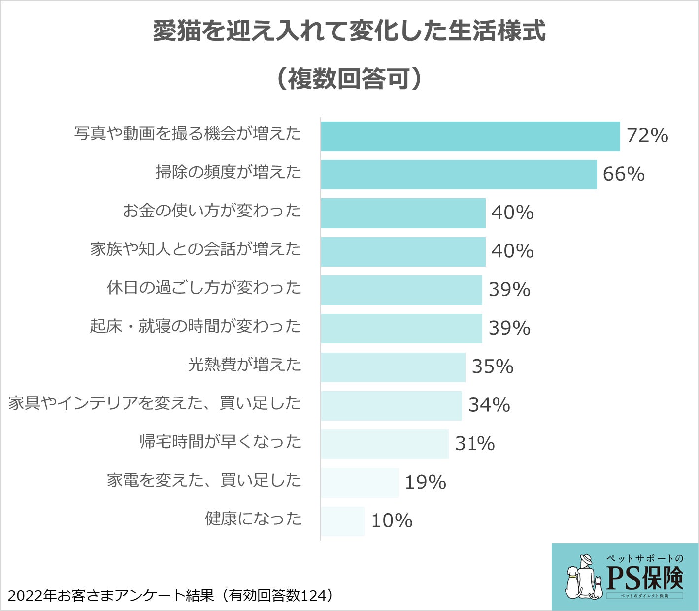 また、「家族や知人との会話が増えた」(40%)、「休日の過ごし方が変わった」「起床・就寝の時間が変わった」(39%)、「帰宅時間が早くなった」(31%)のように、愛猫の存在が飼い主の時間の使い方に変化をもたらしたことがわかりました。