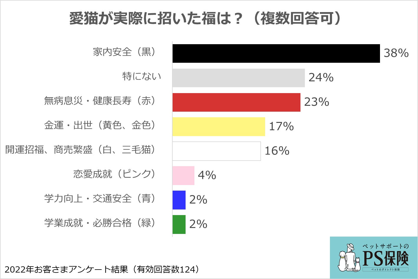 結果は、1位「家内安全(黒)」(38%)が群を抜いて多く、2位「特にない」(24%)、3位「無病息災・健康長寿(赤)」(23%)、4位「金運・出世(黄色、金色)」(17%)、5位「開運招福、商売繁盛(白、三毛猫)」(16%)と続きます。