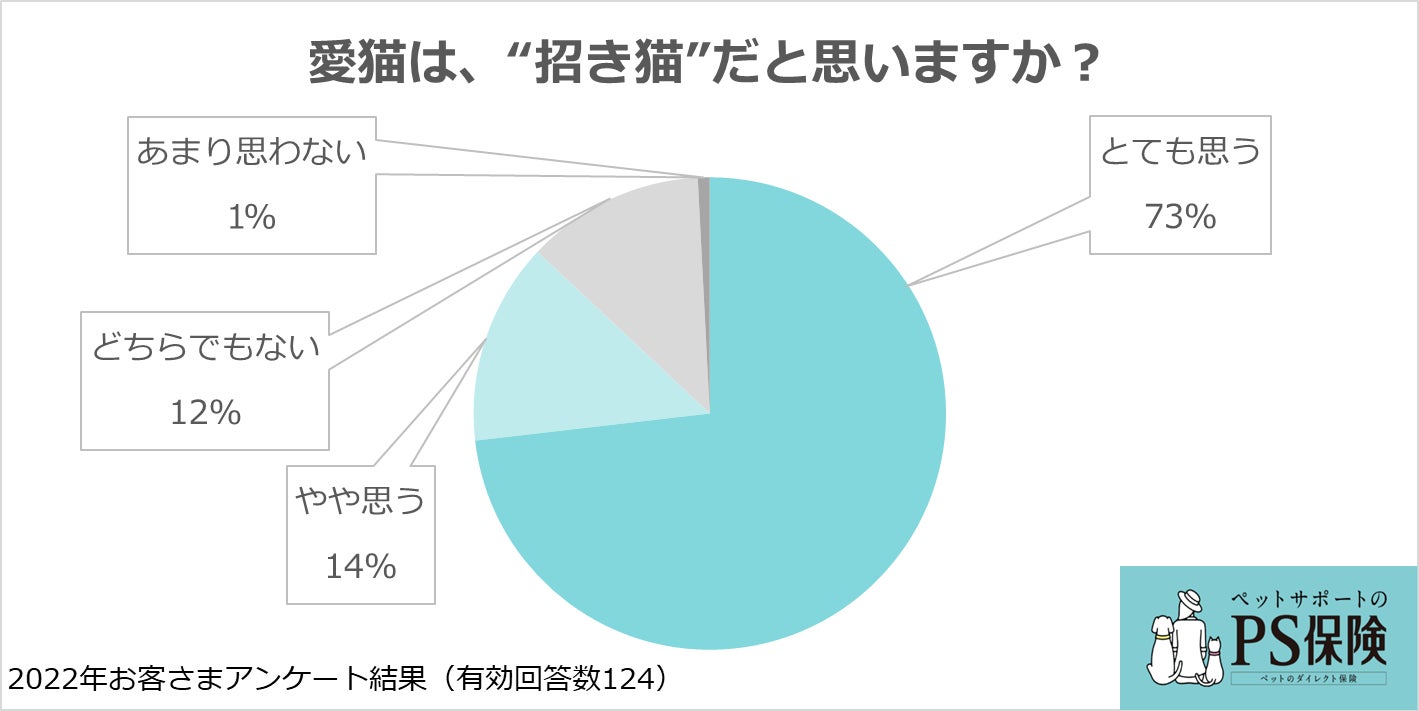 「愛猫は、招き猫だと思いますか」という質問には、「とても思う」(73%)、「やや思う」(14%)と肯定する回答が87%を占めました。今回の調査では、9割に迫る飼い主が、自身の愛猫を招き猫だと認識しているという結果になりました。