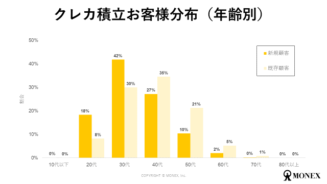 新規顧客では、4割以上のお客様が30代という結果になりました。クレジットカードでの積立は新規・既存どちらも若年層に比重が寄っていることがうかがえます。
