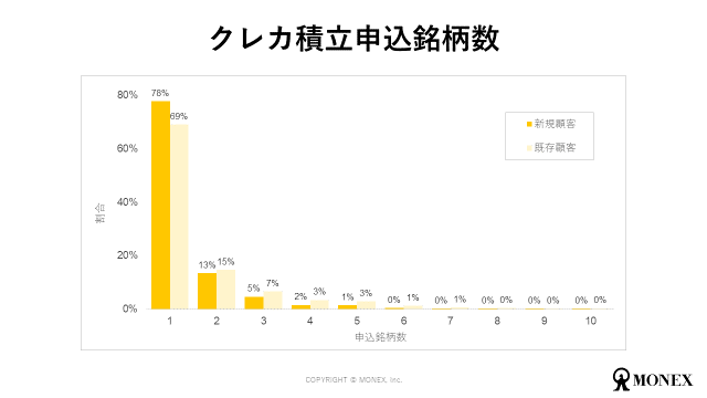 マネックスカードでのクレカ積立の申込銘柄数は1銘柄のみ、という人が新規顧客の8割近く、既存顧客でも7割近くとなりました。マネックス証券では投資を行うお客様には分散投資を幅広く勧めていますが、今後もより一層の啓蒙が必要であるという状況を再認識する結果となっています。