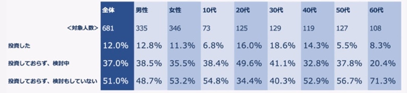 投資へポイント運用を始めた後、初めて現金投資にもチャレンジしたかを聞いたところ、12.0%が「投資した」を選択しました。また37.0%が「投資はしておらず、検討中」を選んでいます。