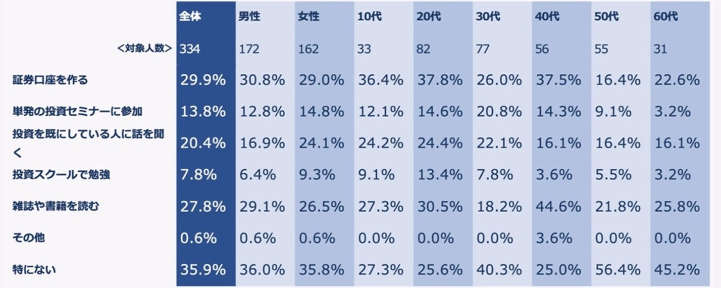 「現金投資しておらず、検討中」と回答した334名に、他にしてみたこと、検討していることを聞いたところ、「証券口座を作る」(29.9%)と、投資の第一歩を具体的に進めてみた人が数多くみられました。
