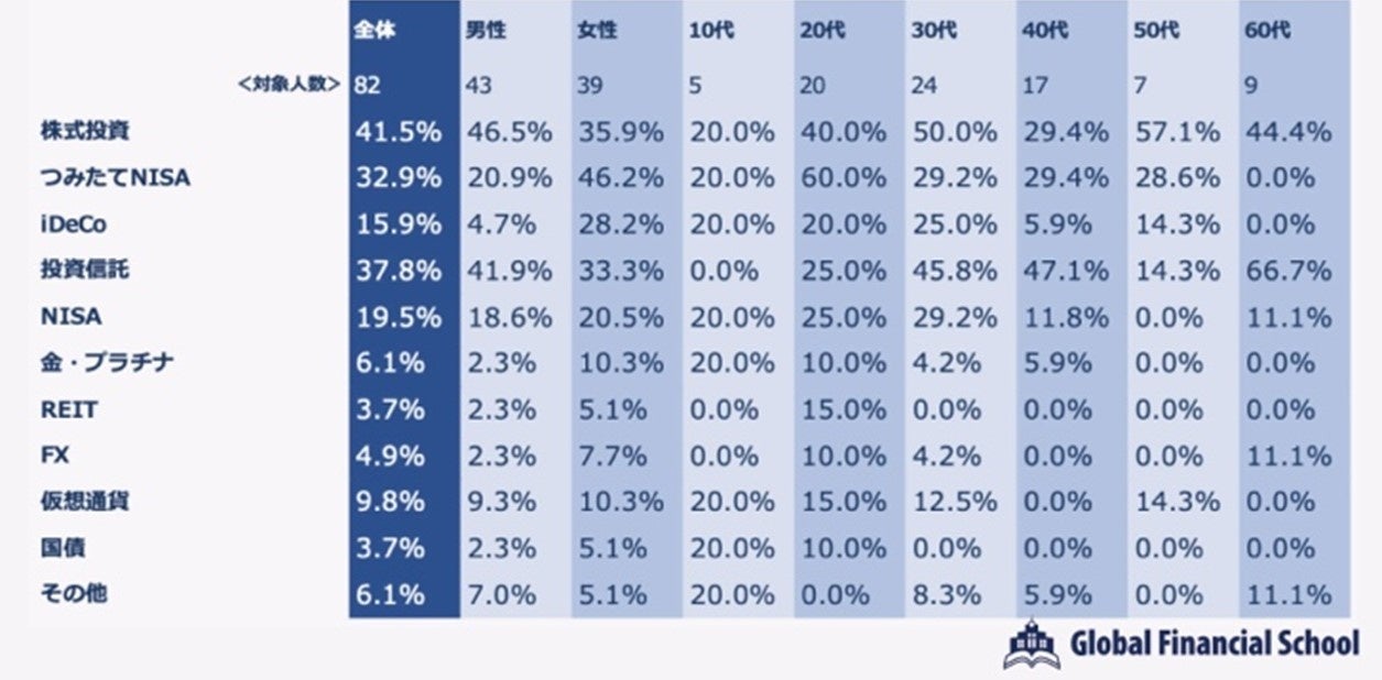 女性や20代では「つみたてNISA」が、40代と60代では「投資信託」が1位になるなど、年代によって傾向に違いがあるようです。回答者数が少ないものの10代で既に投資にチャレンジした人もいました。