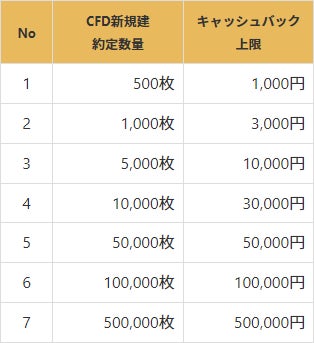 - キャンペーン期間中のCFD取引の新規建て約定枚数に応じて、キャンペーン期間中にお支払いいただいた他商品の取引手数料や信用取引金利・貸株料の一部をキャッシュバックいたします。