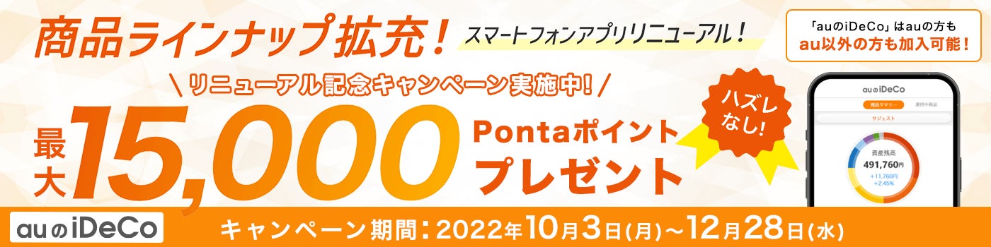 auアセットマネジメント株式会社(以下、「当社」)は、2022年10月下旬より、auのiDeCoの商品ラインナップを5商品から22商品に拡充いたします。また、商品拡充に伴い、iDeCoの運用状況の確認や商品選択(配分指定等)の操作が可能なスマートフォンアプリも直感的に操作いただけるデザインや機能にリニューアルします。さらに、商品拡充を記念して、2022年10月3日から2022年12月28日までの間、最大15,000Pontaポイントが獲得できる「【ハズレなし】auのiDeCo商品拡充記念キャンペーン」(以下、「本キャンペーン」)を実施します。