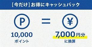 ■期間限定レート:10,000ポイント=7,000円(通常6,000円)→通常10,000ポイント=6,000円分に換算のところ、期間限定で10,000ポイント=7,000円分に換算します。