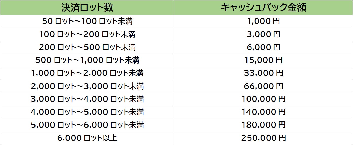 ※6,000ロット以上決済取引された場合でもキャッシュバック金額は25万円です。