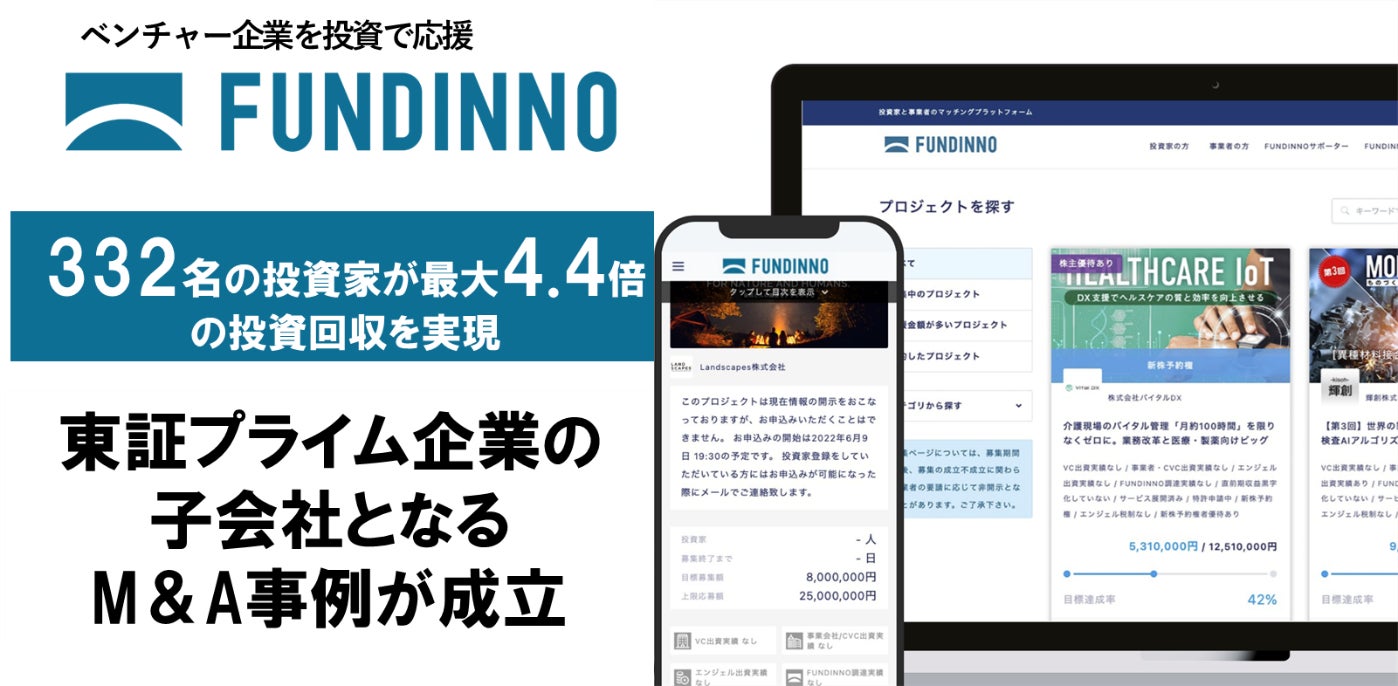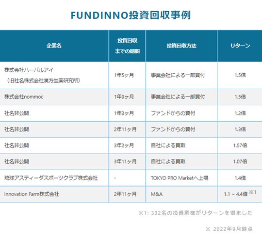 株式会社FUNDINNO(本社:東京都品川区、代表:柴原 祐喜/大浦 学、以下「当社」)は、株式投資型クラウドファンディング「FUNDINNO」を通じて資金調達を行ったInnovation Farm株式会社(本店:東京都板橋区、代表:岡田昇一、以下「Innovation Farm」)において、2022年8月30日付けでM&Aが成立し、株主に対して投資資金を還元したことをお知らせします。