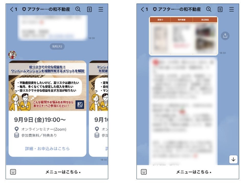 和不動産公式LINEと友だちになると、直近のセミナー情報(画像左)や、非公開物件情報(画像右)が毎週届きます!