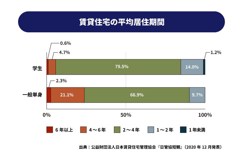 公益財団法人日本賃貸住宅管理協会が2020年12月に発表した『日管協短観』を見ると、学生に比べ一般単身者の方が、賃貸住宅の平均居住期間が長い傾向にあることが分かります。