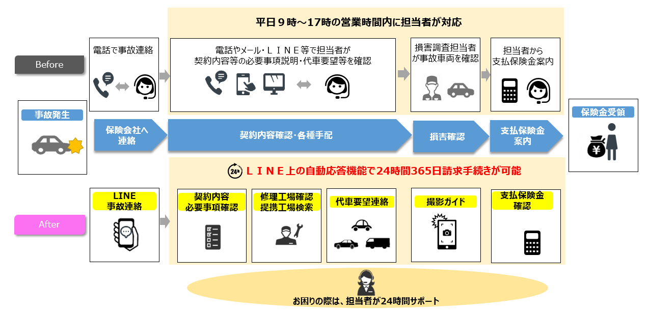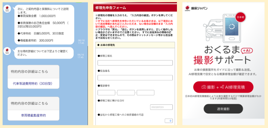 損保ジャパンは、現在保険金の請求手続きについて、電話やメールのほか、「LINEによる保険金請求サービス」により、お客さまがスマートフォン上で保険金支払い担当者とメッセージ等をやりとりできるサービスを提供しており、傷害保険では2020年8月にチャットボットを導入し、迅速な保険金支払いを実現しています。