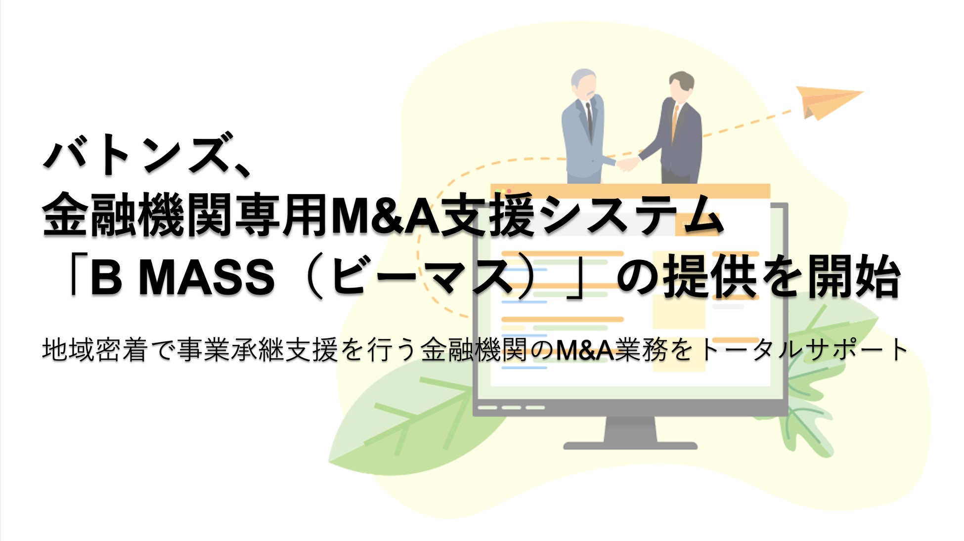 M&A総合支援プラットフォーム「BATONZ(バトンズ)」を運営する株式会社バトンズ(本社:東京都千代田区、代表取締役:神瀬 悠一、以下バトンズ)は金融機関専用M&A支援システム「B MASS(ビーマス)」の提供を開始しましたのでお知らせします。