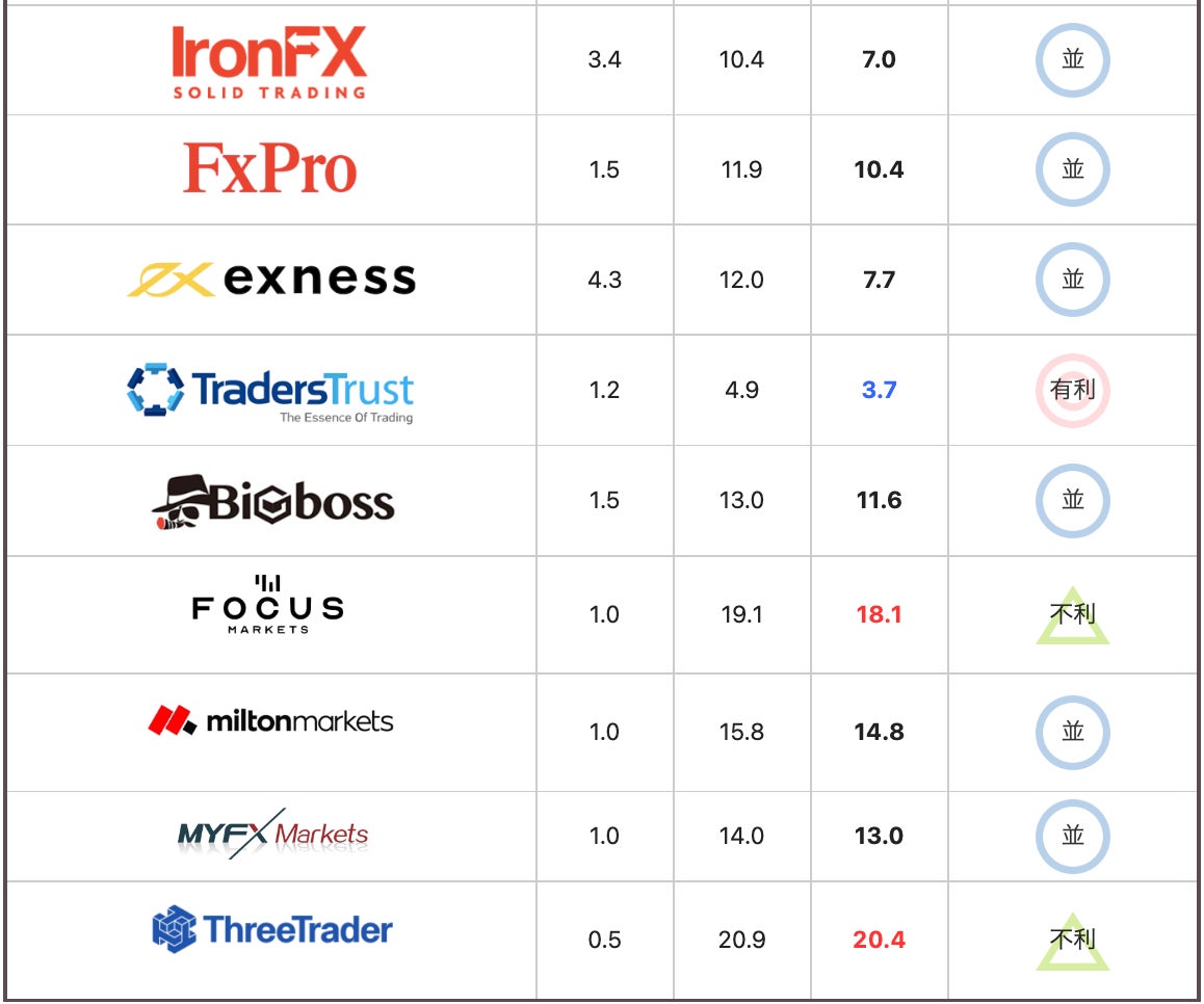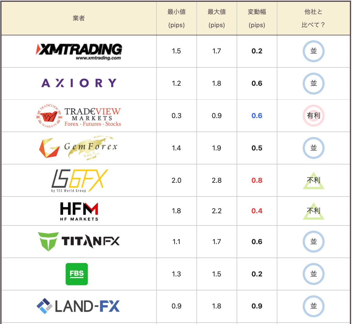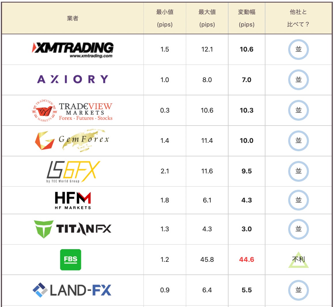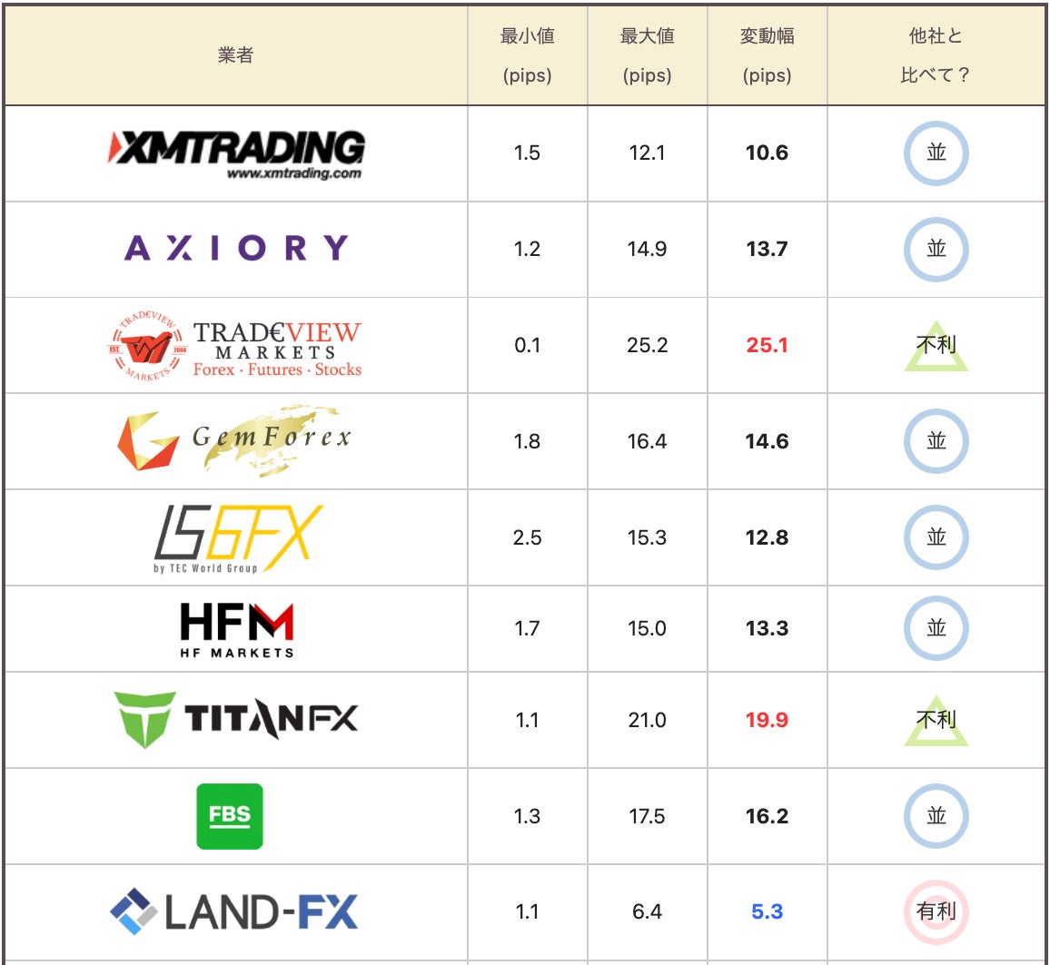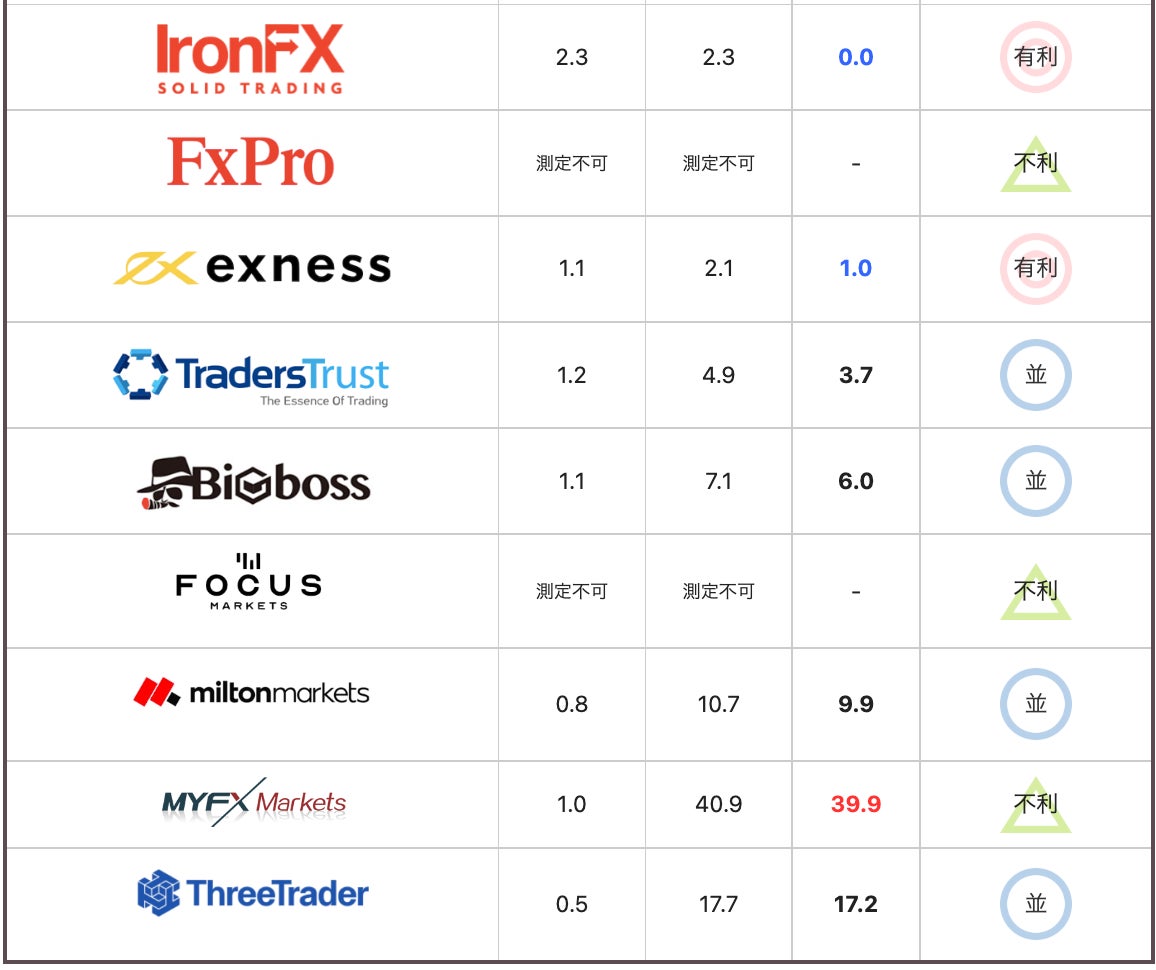 平常時は、TradeView、exness、FocusMarkets、milton markets、ThreeTraderの5社のスプレッドが狭く安定していた。IS6FX、HFM、IronFXの3社は全体的にスプレッドが広い。残り10社は平均的なスプレッドの数値となった。