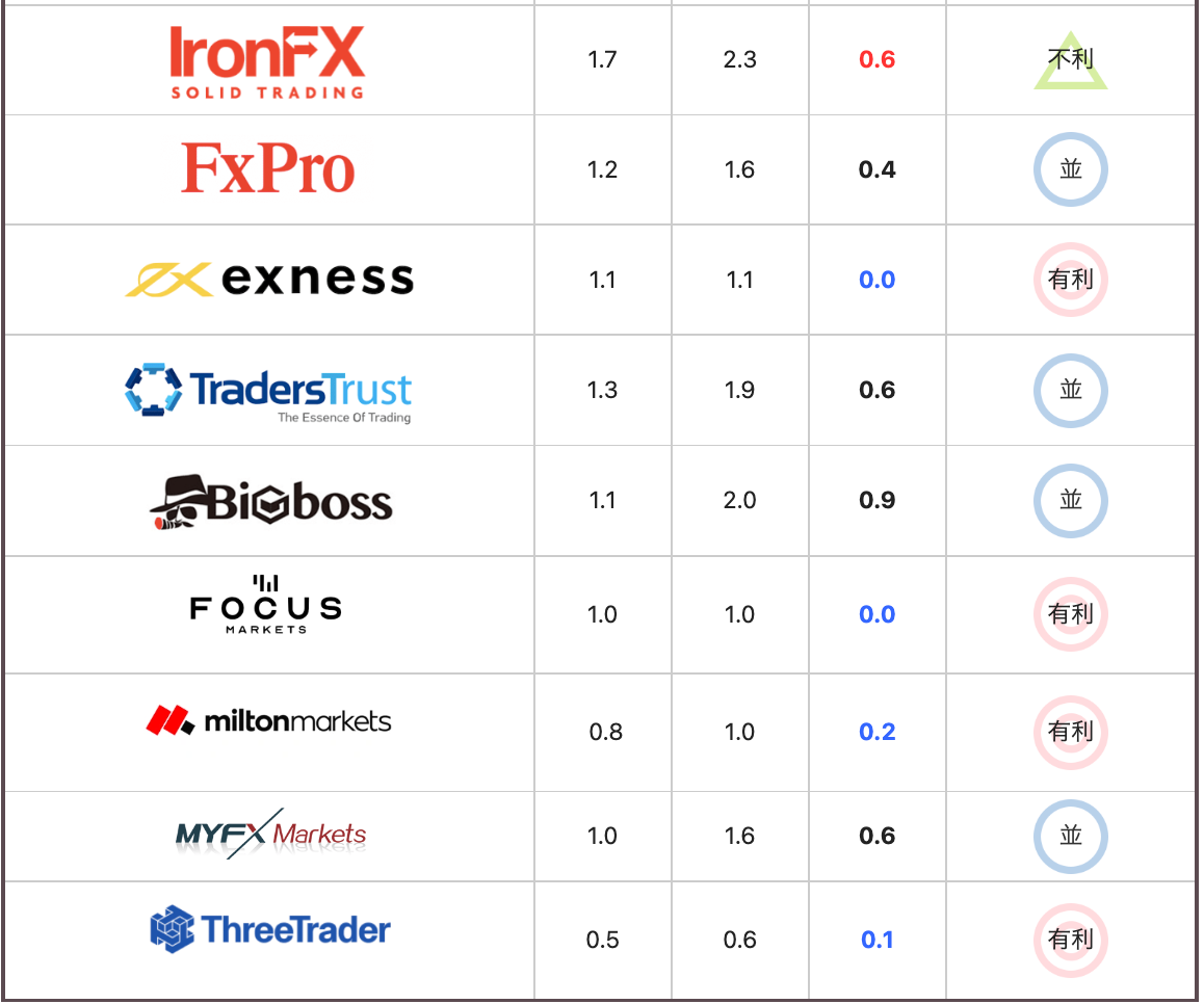 重要指標発表時は、exnessとIronFXの2社のスプレッドが安定していた。FBS、MyFXMarkets、FxPro、FocusMarketsの4社は極端にスプレッドが広がる不安定な環境だった。その他12社はスプレッドがやや広がる結果となった。