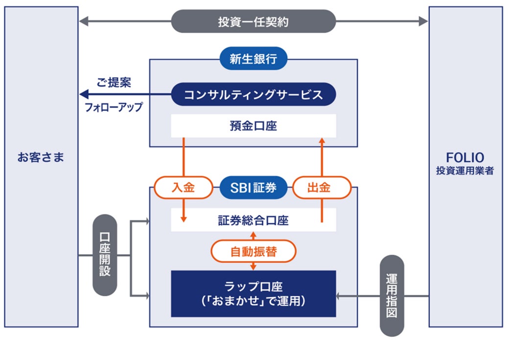 株式会社SBI証券(本社:東京都港区、代表取締役社長:髙村正人、以下「SBI証券」)、株式会社新生銀行(本社:東京都中央区、代表取締役社長:川島克哉、以下「新生銀行」)および株式会社FOLIO(本社:東京都千代田区、代表取締役CEO:甲斐真一郎、以下「FOLIO」)は、2022年10月20日(木)から、投資一任サービス「SBIラップ×新生銀行」(店頭限定)の提供を開始しましたので、お知らせします。