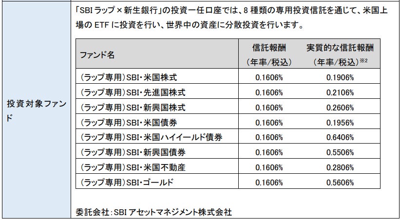 ●SBIラップ×新生銀行は、投資一任契約に基づくサービスであるため、お客さまが自ら投資信託の個別の売買注文を行うことはできません。ご契約にあたっては、サービス概要等をよくお読みください。