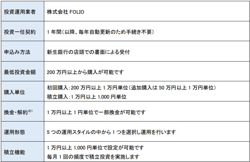 「SBIラップ×新生銀行」(店頭限定)は、FOLIOが提供する投資一任プラットフォーム「4RAP」を活用し、対面チャネル向けに提供する「SBIラップ×」(エスビーアイラップクロス)の第1号商品で、新生銀行での店舗提供に特化した投資一任サービスです。