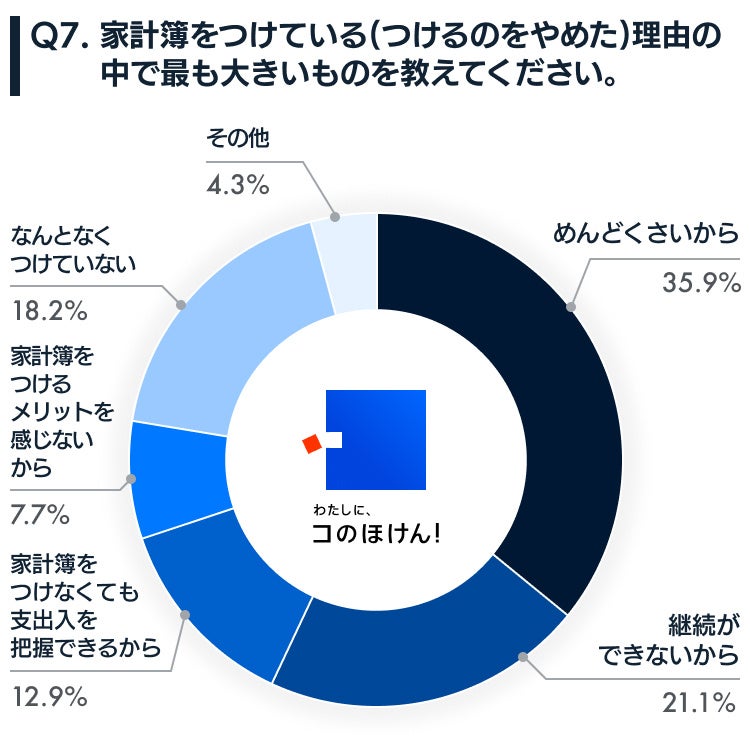 家計簿をつけていない(つけるのをやめた)理由として、もっとも多かった回答は「めんどくさいから」35.9 %、「継続ができないから」21.1 %、「なんとなくつけていない」18.2 %と続いています。
