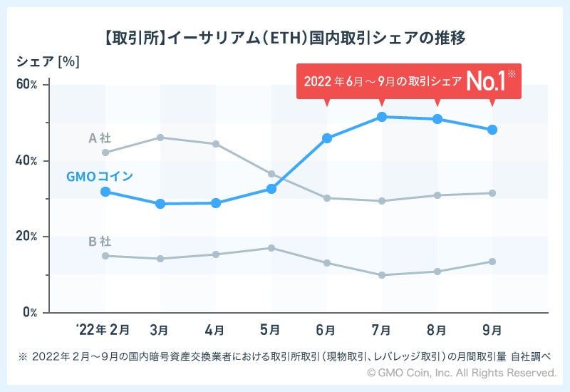 2022年2月から5月にかけて、イーサリアム(ETH)の国内取引所取引におけるGMOコインのシェアは30%前後で推移していましたが、多くのお客さまにご利用いただき、6月に46.5%でシェアNo.1を獲得しました。さらに7月と8月にはシェア50%以上を獲得し、9月を含め4ヶ月連続でシェアNo.1となりました。