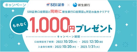 株式会社SBI証券(本社:東京都港区、代表取締役社長:髙村正人、以下「SBI証券」)と株式会社新生銀行(本社:東京都中央区、代表取締役社長:川島克哉、以下「新生銀行」)は、2022年10月20日(木)から、『証券・銀行の同時口座開設申込』の受付を開始したことを、お知らせします。
