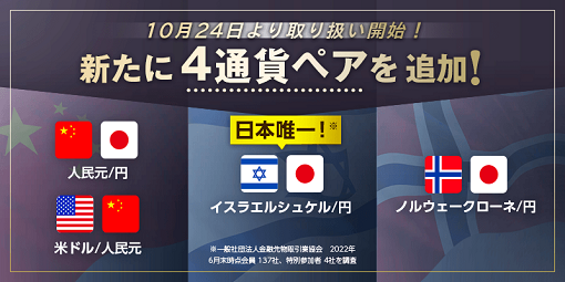 株式会社 マネーパートナーズ(代表取締役社長:福島秀治、本社:東京都港区)は、2022年10月24日よりFX(外国為替証拠金取引)での取扱い通貨ペアに新しく4通貨ペア「人民元/円」「米ドル/人民元」「イスラエルシュケル/円」「ノルウェークローネ/円」を追加いたしました。
