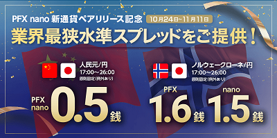 - PFX nano 新通貨ペアリリース記念/業界最狭水準スプレッドをご提供!
