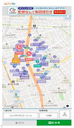 位置情報の入力または調べたいエリアを検索をすることで、近隣のガソリンスタンドと駐車場を検索することができます。検索結果が表示される際、各々の料金も表示されるため、地図上で料金比較をしたうえで利用施設を選択することが可能となります。なお、本サービスは無料でご利用いただけます。