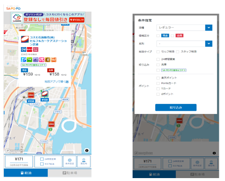 これらのご要望にお応えするため、当社保険契約者限定※のオリジナルサービスとして、「カーライフサービス」内にガソリンスタンドと駐車場の両方を1画面で検索できる「SA・PO・POカーライフマップ」を新設しました。「カーライフマップ」の提供により、よりお得で便利なカーライフの実現をサポートしてまいります。